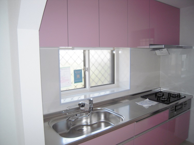 基本プランをベースとして、レンジフードはお手入れしやすいシロッコファンへ変更。ピンクの扉が明るさをUPしています。 -