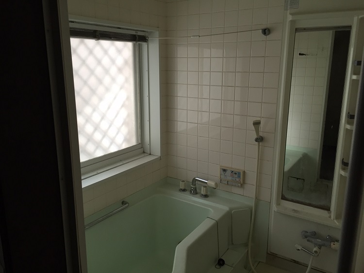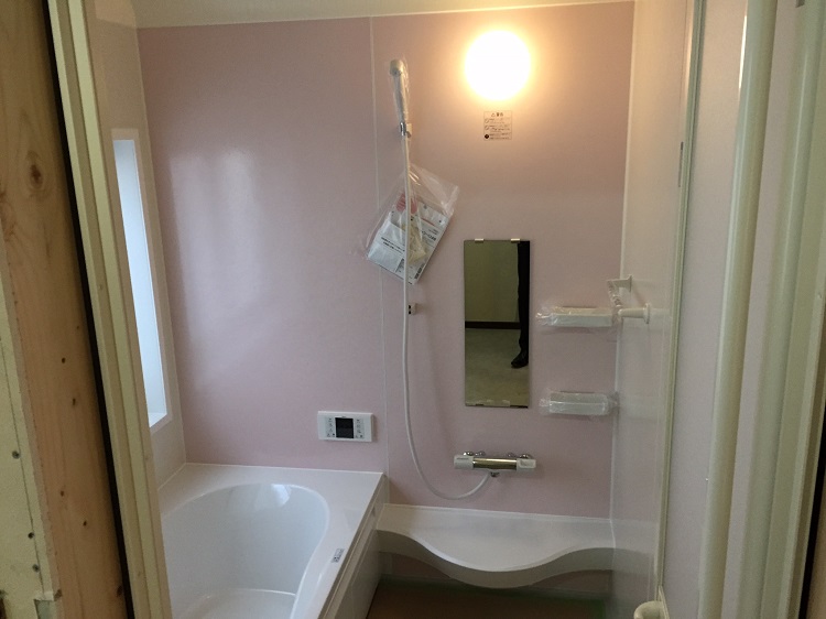 キッチン同様にピンクをアクセントとして、明るいバスルームを演出しています。 -