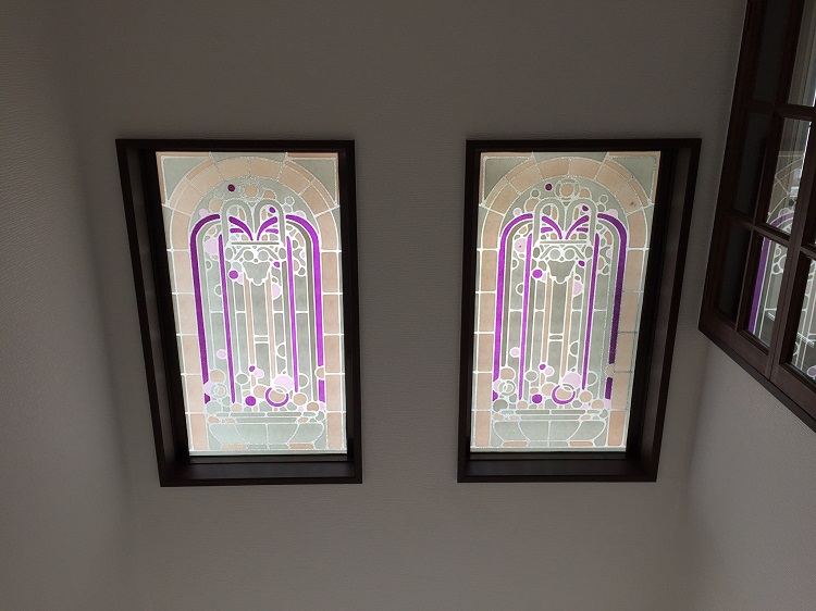 玄関の吹き抜けにあるさFIX窓に取り付けしました。手が抜けがちな玄関が、このガラスがあるだけでとても素敵な印象となりました!